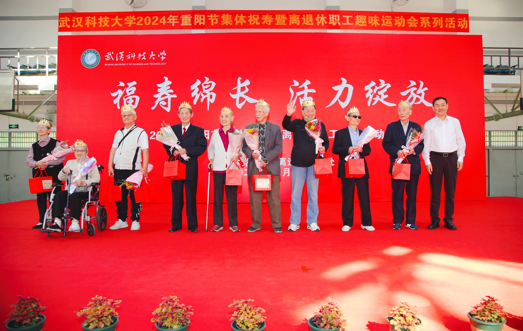 武科大网讯(记者李芳) 10月11日上午,又逢一年一度的重阳佳节。2024年“福寿绵长 活力绽放”集体祝寿暨离退休职工趣味运动会在我校青山校区东院体育馆举行。校党委书记徐雁冰,党委常委、副校长沈季伟,党委常委、组织部部长刘时新同现场90、80、70周岁寿星,老党员、老教师等代表,以及有关职能部门负责人欢聚一堂,共庆佳节。
