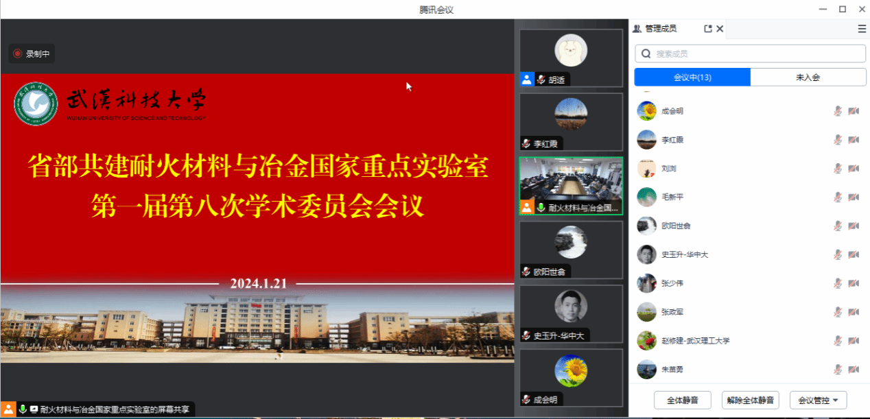 武科大网讯(通讯员李静捷)1月21日下午,省部共建耐火材料与冶金国家重点实验室在青山校区通过线上线下结合的方式召开第一届第八次学术委员会会议。实验室学术委员会副主任中国科学院院士成会明教授、中国工程院院士毛新平教授,学术委员会委员中钢集团李红霞教授、钢铁研究总院刘浏教授、中国建材研究总院欧阳世翕教授、华中科技大学史玉升教授、beat365唯一官网张少伟教授、清华大学张政军教授、武汉理工大学赵修建教授、东北大学朱苗勇教授,湖北省科技厅副厅长杜耘,beat365唯一官网校长倪红卫、副校长马腾,科发院院长夏绪辉、副院长毛前军、实验室主要负责同志、实验室研究团队带头人和青年教师代表40余人参加了会议。马腾主持。