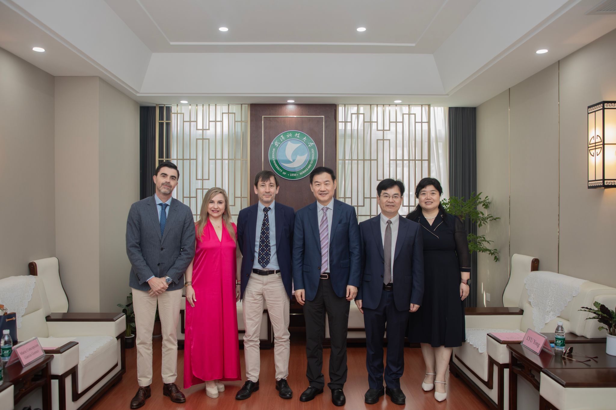 武科大网讯(记者覃宇) 7月3日,西班牙马德里康普顿斯大学副校长米格尔、玛丽亚,国际部部长胡安,中国区办公室主任阿隆索等一行来校访问。校党委书记徐雁冰会见来宾。校长倪红卫、副校长吕勇在黄家湖校区与来宾会晤并带领来宾参观校园。