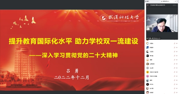 武科大网讯(通讯员郑东昊 张慧)12月15日下午,副校长吕勇在腾讯会议以《提升教育国际化水平,助力学校双一流建设》为题,为国际学院师生作党的二十大精神宣讲报告。国际学院领导班子成员、全体教职工、学生党员代表参加宣讲会。国际学院党委书记朱孟强主持会议。
