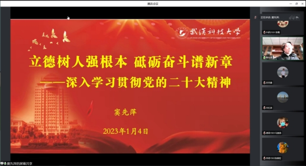 武科大网讯(通讯员李晓明 姜超)1月4日下午,校党委常委、纪委书记窦先萍在腾讯会议以《立德树人强根本,砥砺奋斗谱新章》为题,为外国语学院师生作党的二十大精神宣讲报告。外国语学院领导班子成员、各系部主任与支部书记、全体行政教辅人员、学生党员代表参加宣讲会,学院党委书记苏芳勇主持会议。