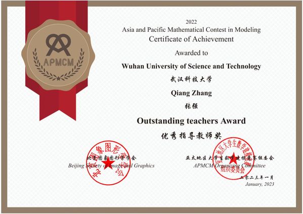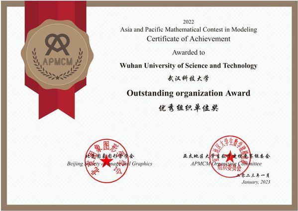武科大网讯 近日,2023第十二届亚太地区大学生数学建模竞赛(APMCM)获奖名单公布,我校数据分析与建模协会斩获一等奖2项、二等奖2项、三等奖8项,两项一等奖的队伍是统计2101班黄宇轩、信计2102班王洪星、统计2102班张作奇和车产2102班吴天一、车产2101班黄佳南、计卓2101班郭庆哲;我校荣获“优秀指导教师奖”和“优秀组织单位奖”。