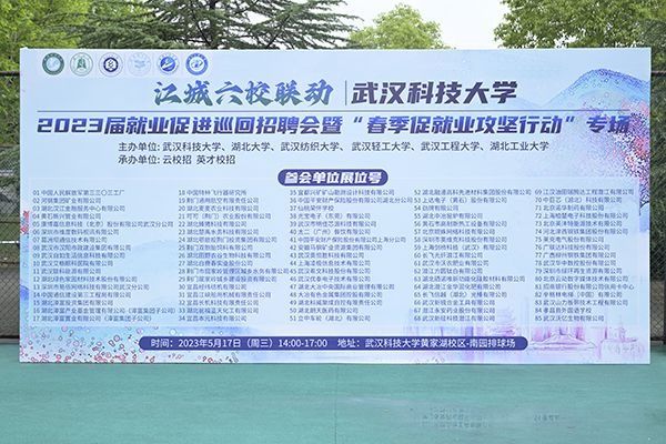 武科大网讯(通讯员熊雄)5月17日,“江城六校联动”2023届就业促进巡回招聘会暨“春季促就业攻坚行动”专场于我校黄家湖校区南园排球场举办,共有87家企事业单位,提供1680个岗位进校招聘。