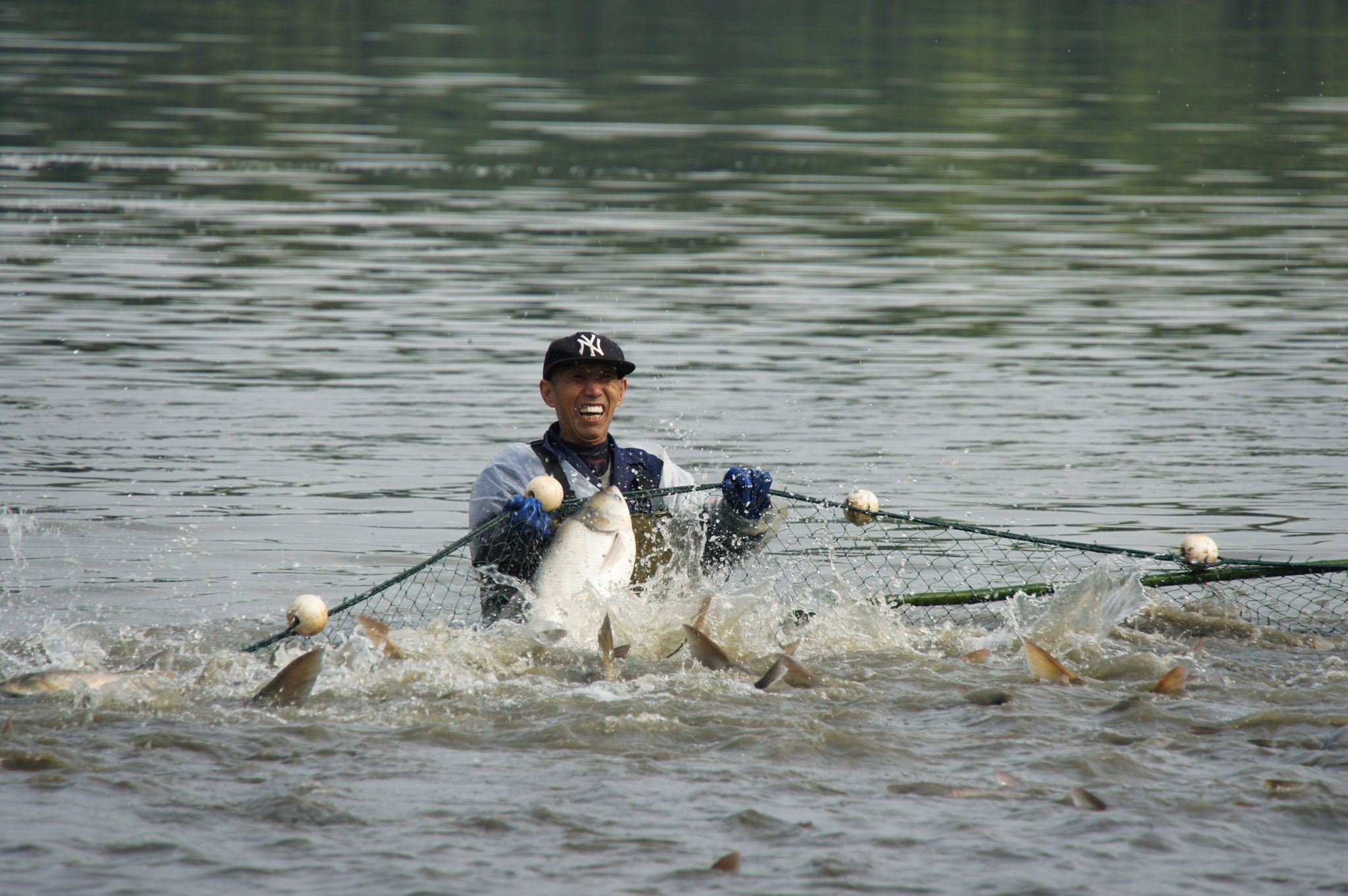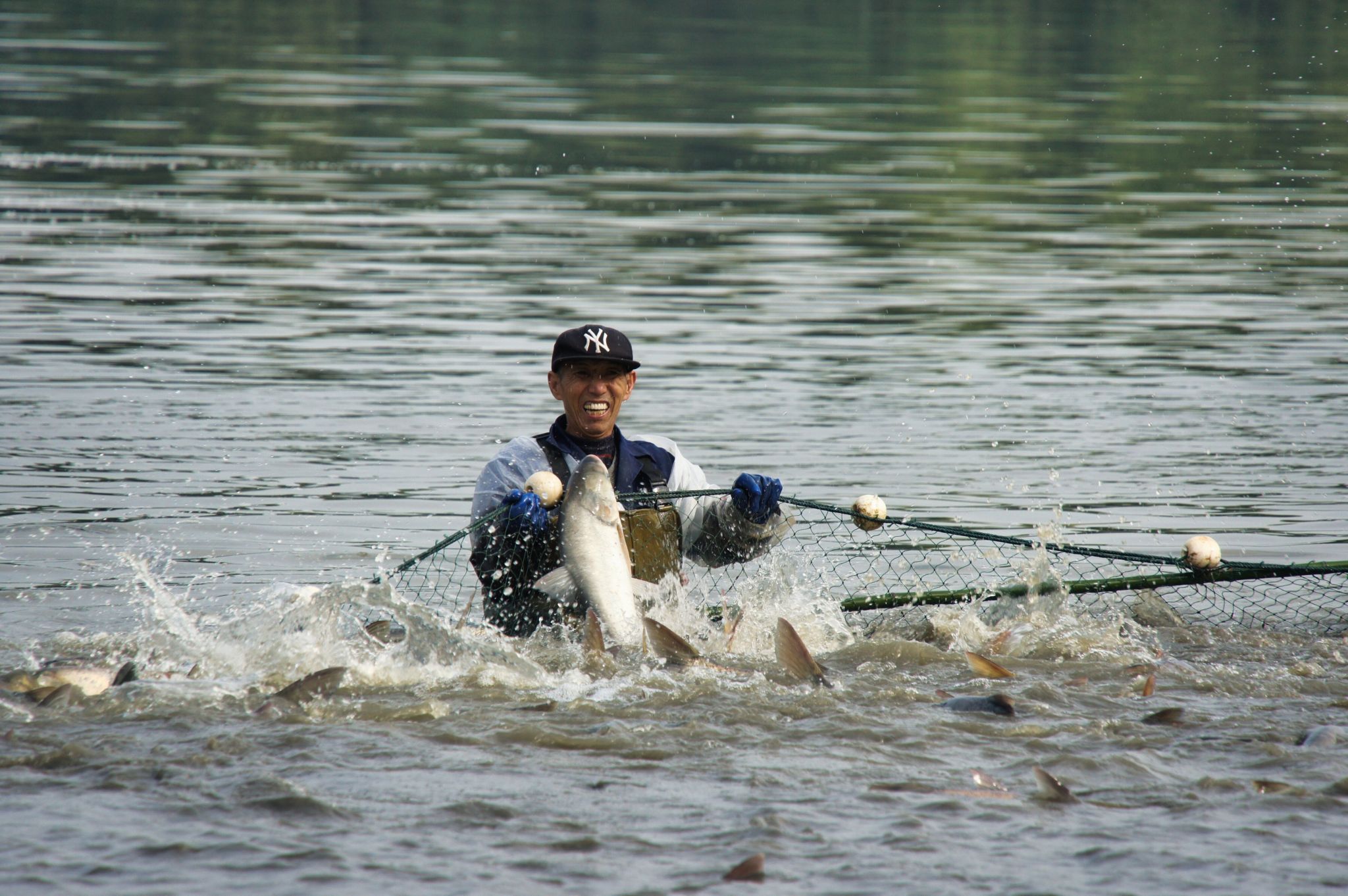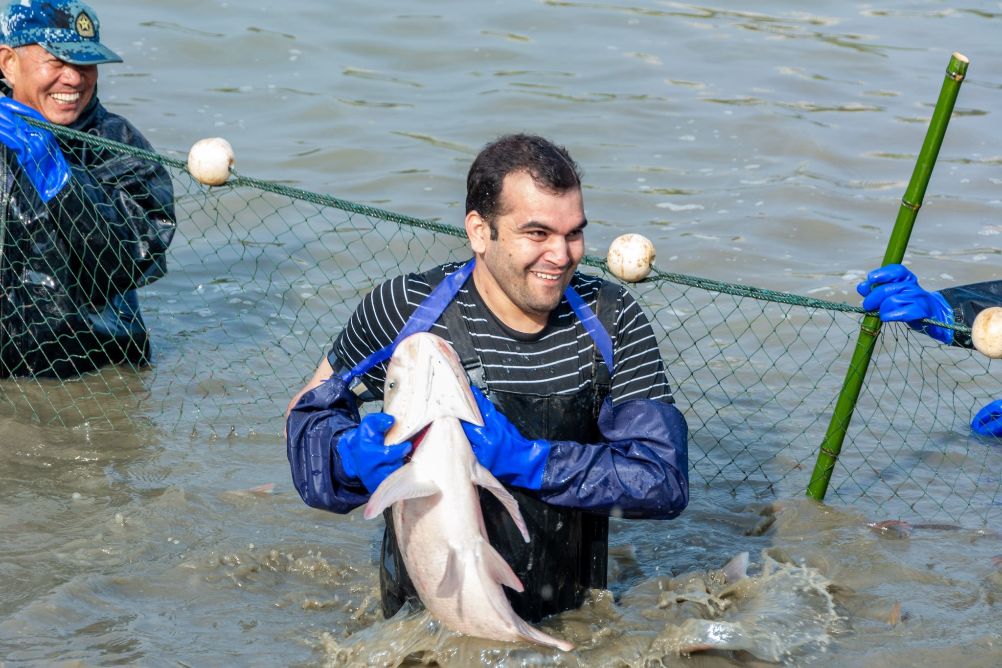 拉鱼后勤爷爷与跃出的鱼特写 陈楷林摄