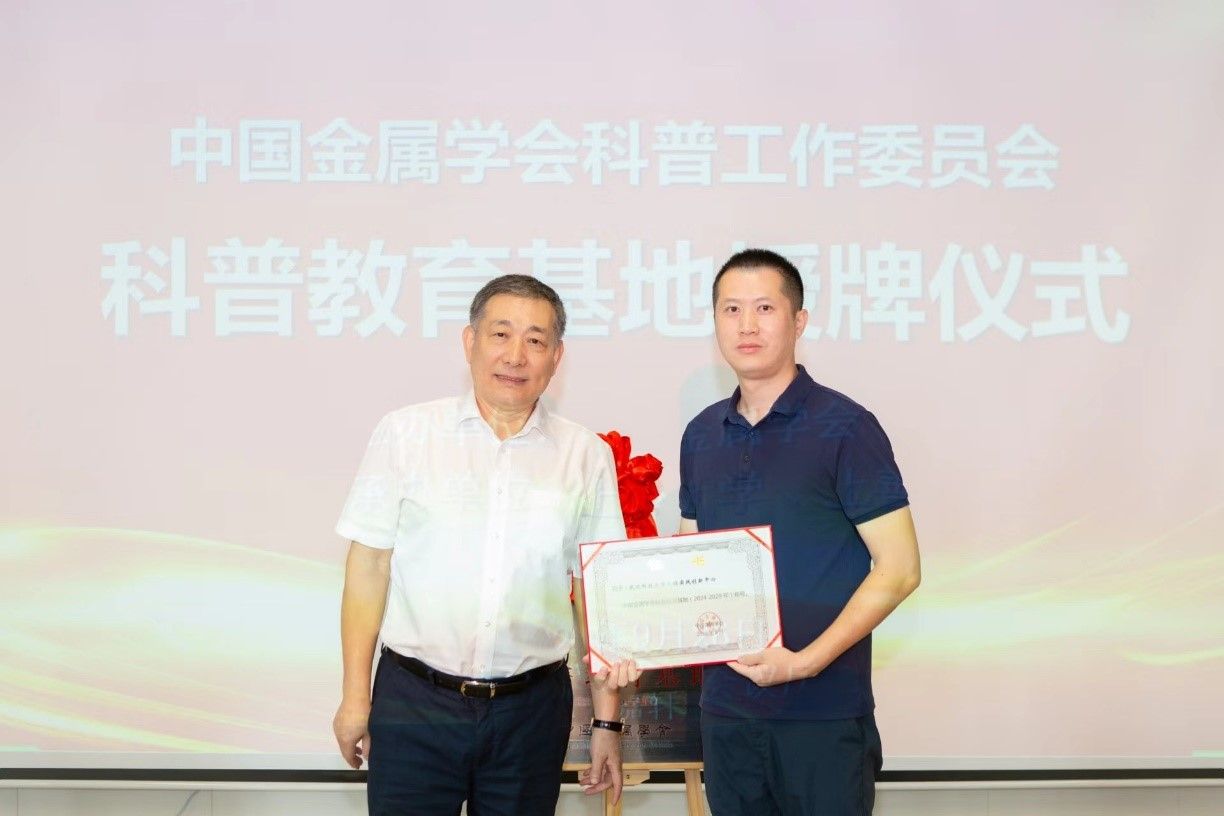 中国金属学会副理事长兼秘书长王新江为我校工程实践创新中心等11家2024年认定的科普教育基地授牌并颁发证书,副主任雷鸣代表中心接受科普教育基地牌匾和证书。