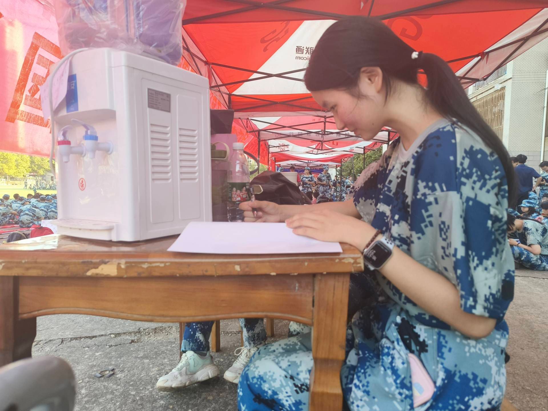 “因为她不能晒太阳,我就让她在帐篷里帮同学们接水、记录请假人数,做些后勤工作。”辅导员裴林茹说。在军训期间,她发现周文君每天都会在本子上记录,“她写了很厚一本,正好我们的军训快报也需要文案,我就想发挥她的特长。”据悉,军训快报是我校各学院收集新生军训感悟和照片的报刊,“我们学院用文君的原创散文诗作为快报文案,是独一无二的,印刷出来也很漂亮。”裴林茹看着手中的军训快报,笑着说。周文君起初十分担心自己会写不好,裴林茹常对她说“我相信你”,给了她很大的自信与支持。