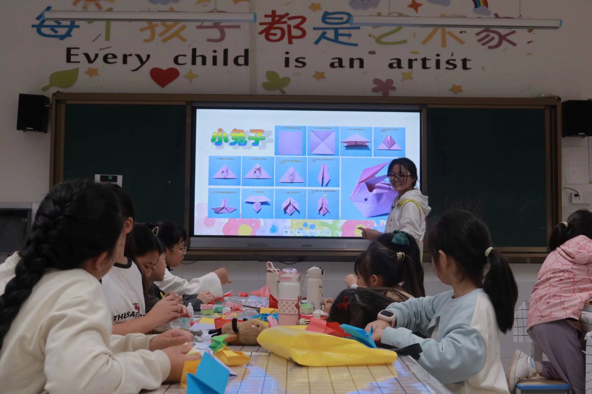 “老师我要学折白雪公主。”“老师,我要学折蛋糕。”“老师,我要折小狗。”……在志愿者赵继栋展示了一系列折纸作品后,孩子们在学折小兔子时,会有一些问题。有的孩子年龄比较小,有个步骤一直学不会。赵继栋走到她们中间,耐心教她每一个步骤。在课堂结束后,学生陈施语送给赵继栋一只红兔子。赵继栋感慨道:“我真的很开心小朋友们能喜欢折纸。这只小兔子真是太可爱了,有被温暖到。”
