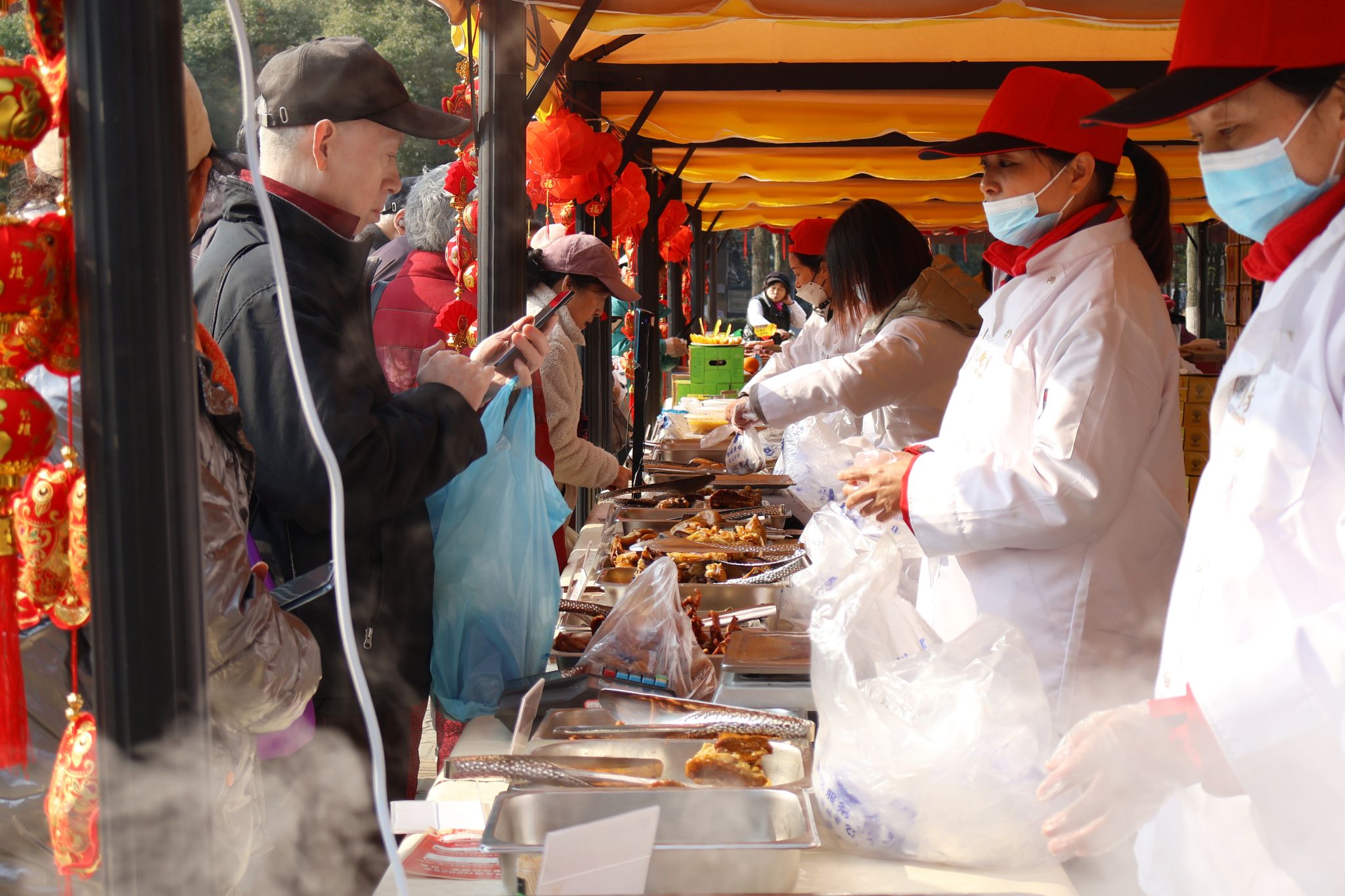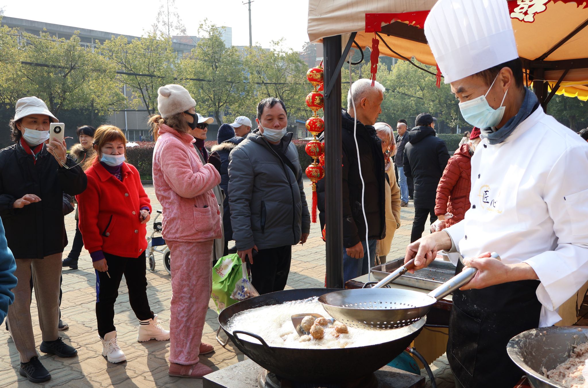 18名后勤保障部工作人员在现场包饺子、炸肉丸、称重切肉、售卖新鲜物资,不少师生前来问价交易。厨师余小东的“东哥肉圆”展位前排起了一条长队,炸油沸腾起的白烟夹着肉丸的香味扑面而来,大家纷纷拿起手机纪录着食品现场制作的全过程。黄奶奶也是排队的一员,“活动办得相当不错,照顾了老年人走不远,食材也都很棒,省心又省力。”